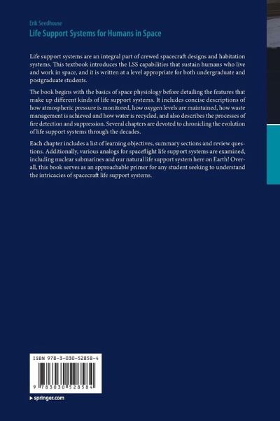 Life support systems are an integral part of crewed spacecraft designs and habitation systems. This textbook introduces the LSS capabilities that sustain humans who live and work in space, and it is written at a level appropriate for both undergraduate and postgraduate students.