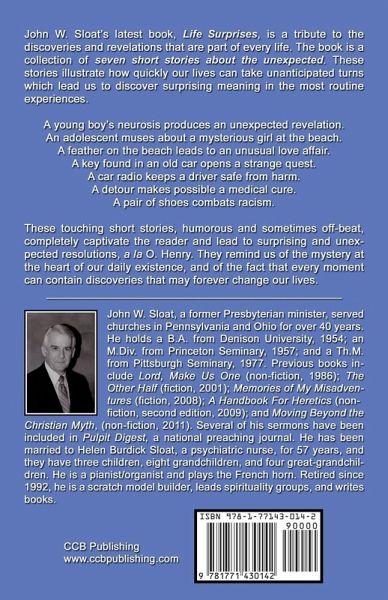 John W. Sloat's latest book, Life Surprises, is a tribute to the discoveries and revelations that are part of every life. The book is a collection of seven short stories about the unexpected. These stories illustrate how quickly our lives can take unanticipated turns which lead us to discover surprising meaning in the most routine experiences. A young boy's neurosis produces an unexpected revelation. An adolescent muses about a mysterious girl at the beach. A feather on the beach leads to an unusual love affair. A key found in an old car opens a strange quest. A car radio keeps a driver safe from harm. A detour makes possible a medical cure. A pair of shoes combats racism. These touching short stories, humorous and sometimes off-beat, completely captivate the reader and lead to surprising and unexpected resolutions, a la O. Henry. They remind us of the mystery at the heart of our daily existence, and of the fact that every moment can contain discoveries that may forever change our lives. About the Author: John W. Sloat, a former Presbyterian minister, served churches in Pennsylvania and Ohio for over 40 years. He holds a B.A. from Denison University, 1954; an M.Div. from Princeton Seminary, 1957; and a Th.M. from Pittsburgh Seminary, 1977. Previous books include Lord, Make Us One (non-fiction, 1986); The Other Half (fiction, 2001); Memories of My Misadventures (fiction, 2008); A Handbook For Heretics (non-fiction, second edition, 2009); and Moving Beyond the Christian Myth, (non-fiction, 2011). Several of his sermons have been included in Pulpit Digest, a national preaching journal. He has been married to Helen Burdick Sloat, a psychiatric nurse, for 57 years, and they have three children, eight grandchildren, and four great-grandchildren. He is a pianist/organist and plays the French horn. Retired since 1992, he is a scratch model builder, leads spirituality groups, and writes books.