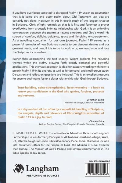 If you have ever been tempted to disregard Psalm 119 under an assumption that it is some dry and dusty psalm about Old Testament law, you are certainly not alone. However, in this in-depth study of the longest chapter in Scripture, Chris Wright reminds us that it is first and foremost a prayer overflowing from a deeply intimate relationship with God. It is an unfolding conversation between the psalmist's rawest emotions and God's word, his source of comfort, delight, guidance, grace and life-giving encouragement. As a travelling companion for our own journeys, Psalm 119 serves as a powerful reminder of how Scripture speaks to our deepest desires and our greatest needs, and how, if it is to do its work in us, we must know and love the Scripture for ourselves. Rather than approaching the text linearly, Wright explores five recurring themes within the psalm, drawing forth deeply personal and powerful applications. This thematic approach is ideal for pastors wrestling with how to preach Psalm 119 in its entirety, as well as for personal and small group study. Discussion and reflection questions are included. This is an excellent resource for anyone desiring to foster a closer relationship with God through Scripture.