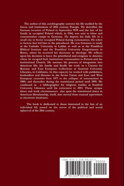 The author of this autobiography narrates his life molded by the forces and institutions of 20th century Europe: the German occupation of Poland and daily life in a small city in Soviet occupied Poland. He discusses his priesthood and his studies at the Catholic University in Lublin and at the Pontifical Biblical Institute and the Pontifical University Gregorianum in Rome where he received his doctorate in theology. He reflects upon his decision to leave the priesthood and immigrate to America. He narrates his process of integration into American life, his family and his work as a Curator for Russian and East European Collections at Stanford University Libraries, in California with publishers, booksellers and libraries in the Soviet Union and East and West European countries from 1971 until 1999 and thereafter as a Bibliographer for Religious Studies until his retirement in 2013. He also outlines his professional contributions.