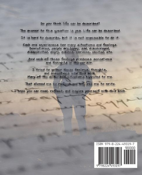 Do you think life can be described? The answer to this question is yes. Life can be described. It is hard to describe, but it is not impossible to do it. Each one experiences too many situations and feelings. Sometimes, people are happy, sad, discouraged, disappointed, angry, anxious, nervous, excited, etc. And each of these feelings produces sensations and thoughts in the person. I tried to gather these feelings, thoughts, and sensations into this book. Many of the described situations happened to me. That allowed me to reflect and inspired me to write. I hope you can read, reflect, and inspire yourself with this book.