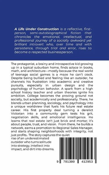 A Life Under Construction: The Dirt Beneath the Deals: is a reflective, first-person, semi-autobiographical fiction that chronicles the emotional, intellectual, and professional journey of a socially awkward yet brilliant introvert who rises to become a respected businessperson. The protagonist, a brainy and introspective kid growing up in a typical suburban home, finds solace in books, math, and architecture-mostly because the real world of teenage social games is a maze he can't crack. Despite being bullied and feeling like an outsider, he channels his frustration into academic and creative pursuits, especially in urban design and the psychology of human behavior. A spark from a high school history teacher and urban theories ignite his ambition. College becomes the proving ground-not socially, but academically and professionally. There, he blends urban planning, sociology, and psychology into a unique worldview that fuels his future real estate career. His first property deal-turning a derelict Victorian into a community gem-tests his grit, negotiation skills, and emotional intelligence. He learns that real estate isn't just brick and mortar; it's about people, trust, and vision. From there, he builds a network, earns a promotion to Regional Sales Manager, and starts shaping neighborhoods with integrity, not just profits. The story captures the quiet rise of an underestimated outsider who turns solitude into strategy, intellect into impact, and dirt into dreams.