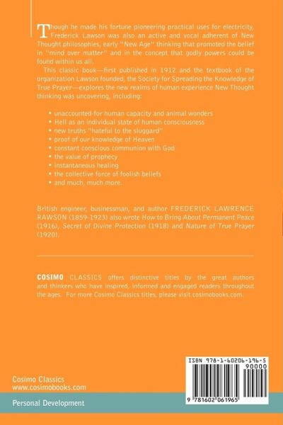 Though he made his fortune pioneering practical uses for electricity, Frederick Lawson was also an active and vocal adherent of New Thought philosophies, early "New Age" thinking that promoted the belief in "mind over matter" and in the concept that godly powers could be found within us all. This classic book-first published in 1912 and the textbook of the organization Lawson founded, the Society for Spreading the Knowledge of True Prayer-explores the new realms of human experience New Thought thinking was uncovering, including: . Unaccounted-for human capacity and animal wonders . Hell as an individual state of human consciousness . New truths "hateful to the sluggard" . Proof of our knowledge of Heaven . Constant conscious communion with God . The value of prophecy . Instantaneous healing . The collective force of foolish beliefs . And much, much more. British engineer, businessman, and author FREDERICK LAWRENCE RAWSON (1859-1923) also wrote How to Bring About Permanent Peace (1916), Secret of Divine Protection (1918) and Nature of True Prayer (1920).