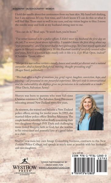 I hold the needle about five centimeters from my bare skin. My hand isn't shaking, but I am nervous. It's my first time, and I don't know if I can do this or what it will feel like. Tears start to well in my eyes, and my vision begins to blur. I move the needle away and look at my husband sitting next to me. "You can do it," Brad says. "It won't hurt, you're brave." Book Reviews: "I've never wanted to be a police officer, I didn't meet my husband the first day on the job, I've never faced down infertility, I wouldn't know the first thing about my 'style personality', and I've never had to bury guinea pigs. Yet I met myself again and again in Sheryn's wonderful story. In this Facebook world of carefully curated selfies and posts, here is a woman who totally tells it like it is. Life Wide Open, indeed!" (Christina Tyson, editor) "Sheryn is a marvellous writer-totally honest and candid yet discreet and a natural storyteller. And so funny! Delightful, moving, thought-provoking stuff." (Roger Steele, publisher) "This book offers a buffet of emotions: joy, grief, regret, laughter, conviction, hope, and blessing-all presented in one powerful experience. Sheryn's style is conversational and the vulnerability she displays gives me permission to be vulnerable as a reader." (Shar Davis, Salvation Army)
