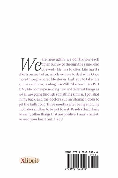 We are here again, we dont know each other, but we go through the same kind of events life has to offer. Life has its effects on each of us, which we have to deal with. Once more through shared life stories, I ask you to take this journey with me, reading Life Will Take You There Part 3: My Memoir, experiencing new and different things as we all are going through something similar. I got shot in my back, and the doctors cut my stomach open to get the bullet out. Three months after being shot, my mom dies and has to be put to rest. Besides that, I have so many other things that are positive. I must share it, so read your heart out. Enjoy!
