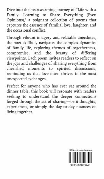 Dive into the heartwarming journey of "Life with a Family: Learning to Share Everything (Even Opinions)," a poignant collection of poems that captures the essence of familial love, laughter, and the occasional conflict. Through vibrant imagery and relatable anecdotes, the poet skillfully navigates the complex dynamics of family life, exploring themes of togetherness, compromise, and the beauty of differing viewpoints. Each poem invites readers to reflect on the joys and challenges of sharing everything from cherished moments to spirited discussions, reminding us that love often thrives in the most unexpected exchanges. Perfect for anyone who has ever sat around the dinner table, this book will resonate with readers seeking to understand the deeper connections forged through the act of sharing-be it thoughts, experiences, or simply the day-to-day nuances of living together.