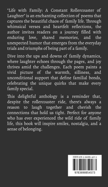 "Life with Family: A Constant Rollercoaster of Laughter" is an enchanting collection of poems that captures the beautiful chaos of family life. Through whimsical verses and heartfelt reflections, the author invites readers on a journey filled with enduring love, shared memories, and the unexpected humor that emerges from the everyday trials and triumphs of being part of a family. Dive into the ups and downs of family dynamics, where laughter echoes through the pages, and joy thrives amid the challenges. Each poem paints a vivid picture of the warmth, silliness, and unconditional support that define familial bonds, celebrating the unique quirks that make every family special. This delightful anthology is a reminder that, despite the rollercoaster ride, there's always a reason to laugh together and cherish the connections that hold us tight. Perfect for anyone who has ever experienced the wild ride of family life, this book will inspire smiles, nostalgia, and a sense of belonging.