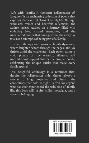 "Life with Family: A Constant Rollercoaster of Laughter" is an enchanting collection of poems that captures the beautiful chaos of family life. Through whimsical verses and heartfelt reflections, the author invites readers on a journey filled with enduring love, shared memories, and the unexpected humor that emerges from the everyday trials and triumphs of being part of a family. Dive into the ups and downs of family dynamics, where laughter echoes through the pages, and joy thrives amid the challenges. Each poem paints a vivid picture of the warmth, silliness, and unconditional support that define familial bonds, celebrating the unique quirks that make every family special. This delightful anthology is a reminder that, despite the rollercoaster ride, there's always a reason to laugh together and cherish the connections that hold us tight. Perfect for anyone who has ever experienced the wild ride of family life, this book will inspire smiles, nostalgia, and a sense of belonging.