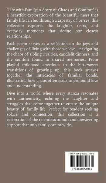 "Life with Family: A Story of Chaos and Comfort" is a heartfelt exploration of the beautiful mess that family life can be. Through a tapestry of verses, this collection captures the laughter, tears, and everyday moments that define our closest relationships. Each poem serves as a reflection on the joys and challenges of living with those we love-navigating the chaos of sibling rivalries, candlelit dinners, and the comfort found in shared memories. From playful childhood anecdotes to the bittersweet transitions of growing up, this book weaves together the intricacies of familial bonds, illustrating how chaos often leads to profound love and understanding. Dive into a world where every stanza resonates with authenticity, echoing the laughter and struggles that come together to create the unique beauty of family life. Perfect for readers seeking solace and connection, this collection is a celebration of the relentless tumult and unwavering support that only family can provide.