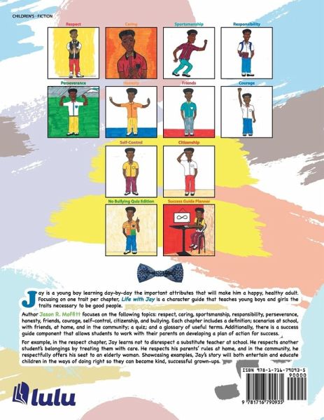 Jay is a young boy learning day-by-day the important attributes that will make him a happy, healthy adult. Focusing on one trait per chapter, Life with Jay is a character guide that teaches young boys and girls the traits necessary to be good people. Author Jason R. Moffitt focuses on the following topics: respect, caring, sportsmanship, responsibility, perseverance, honesty, friends, courage, self-control, citizenship, and bullying. Each chapter includes a definition; scenarios at school, with friends, at home, and in the community; a quiz; and a glossary of useful terms. Additionally, there is a success guide component that allows students to work with their parents on developing a plan of action for success. For example, in the respect chapter, Jay learns not to disrespect a substitute teacher at school. He respects another student's belongings by treating them with care. He respects his parents' rules at home, and in the community, he respectfully offers his seat to an elderly woman. Showcasing examples, Jay's story will both entertain and educate children in the ways of doing right so they can become kind, successful grown-ups.
