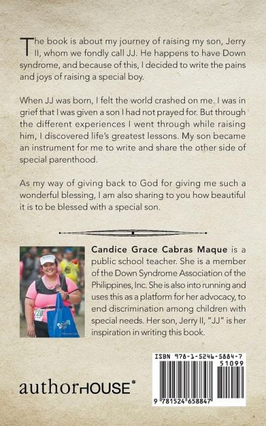 The book is about my journey of raising my son, Jerry II, whom we fondly call JJ. He happens to have Down syndrome, and because of this, I decided to write the pains and joys of raising a special boy. When JJ was born, I felt the world crashed on me. I was in grief that I was given a son I had not prayed for. But through the different experiences I went through while raising him, I discovered life's greatest lessons. My son became an instrument for me to write and share the other side of special parenthood. As my way of giving back to God for giving me such a wonderful blessing, I am also sharing to you how beautiful it is to be blessed with a special son.
