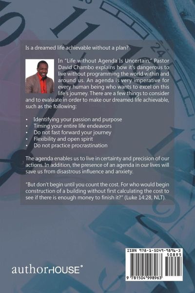 Is a dreamed life achievable without a plan? In "Life without Agenda Is Uncertain," Pastor David Chambo explains how it's dangerous to live without programming the world within and around us. An agenda is very imperative for every human being who wants to excel on this life's journey. There are a few things to consider and to evaluate in order to make our dreamed life achievable, such as the following: Identifying your passion and purpose Timing your entire life endeavors Do not fast forward your journey Flexibility and open spirit Do not practice procrastination The agenda enables us to live in certainty and precision of our actions. In addition, the presence of an agenda in our lives will save us from disastrous influence and anxiety. "But don't begin until you count the cost. For who would begin construction of a building without first calculating the cost to see if there is enough money to finish it?" (Luke 14:28, NLT).