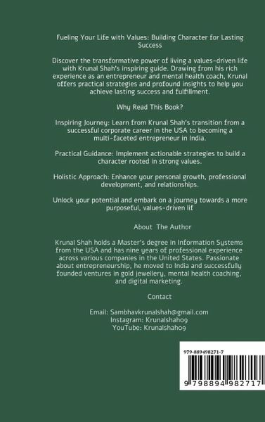 Fueling Your Life with Values: Building Character for Lasting Success Discover the transformative power of living a values-driven life with Krunal Shah's inspiring guide. Drawing from his rich experience as an entrepreneur and mental health coach, Krunal offers practical strategies and profound insights to help you achieve lasting success and fulfillment. Why Read This Book? Inspiring Journey: Learn from Krunal Shah's transition from a successful corporate career in the USA to becoming a multi-faceted entrepreneur in India. Practical Guidance: Implement actionable strategies to build a character rooted in strong values. Holistic Approach: Enhance your personal growth, professional development, and relationships. Unlock your potential and embark on a journey towards a more purposeful, values-driven life.