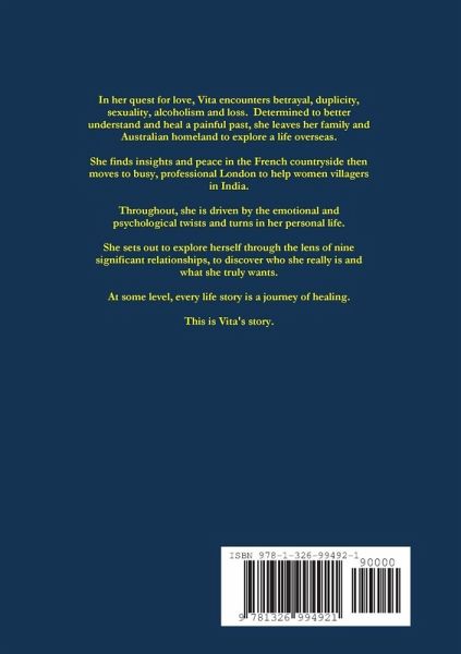 In her quest for love, Vita encounters betrayal, duplicity, sexuality, alcoholism and loss. Determined to better understand and heal a painful past, she leaves her family and Australian homeland to explore a life overseas. She finds insights and peace in the French countryside then moves to busy, professional London to help women villagers in India. Throughout, she is driven by the emotional and psychological twists and turns in her personal life. She sets out to explore herself through the lens of nine significant relationships, to discover who she really is and what she truly wants. At some level, every life story is a journey of healing. This is Vita's story.