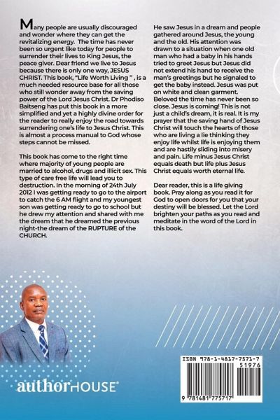 Life Worth Living Many people are easily discouraged and wonder where they can get the revitalising energy. The time has never been so urgent like today for people to surrender their lives to King Jesus, the peace giver. Dear fiend we live this life once let us commit our lives to Jesus because there is only one way, JESUS CHRIST. This book, "Life Worth Living", is a much needed resource base for all those who still wonder away from the saving power of the Lord Jesus Christ. Dr Phodiso Baitseng has put this book in a more simplified and yet highly divine order for the reader to really enjoy the road towards surrendering one's life to Jesus Christ. This is almost a process manual to God whose steps cannot be missed. This book has come at the right time where majority of young people are married to alcohol, drugs and illicit sex. This type of care free life will lead you to destruction. In the morning of 24th July 2012 I was getting ready to go to the airport to catch the 6 AM flight and he was getting ready to go to school my youngest son of my three children drew my attention with the picture of the RUPTURE of the Church. He saw Jesus in a dream and people were gathered around Jesus, the young and the old. His attention was drawn to a situation when one old man who had a baby in his hands tried to greet Jesus but Jesus did not extend His hand to receive the man's greetings but He signalled to get the baby instead. Jesus was put on white and clean garment. Beloved the time has never been so close. Jesus is coming! This is not just a child's dream, it is real. It is my prayer that the saving hand of Jesus Christ will touch the hearts of all those who are living a lie thinking they enjoy life whilst life is enjoying them and are hastily sliding into misery and pain. Life minus Jesus Christ equal death but Life plus Jesus Christ equal worth eternal life. Dear reader, this is a life giving book. Pray along as you read it for God to open doors for you that your destiny will be blessed. Let the Lord brighten your paths as you read and meditate in the word of the Lord in this book.