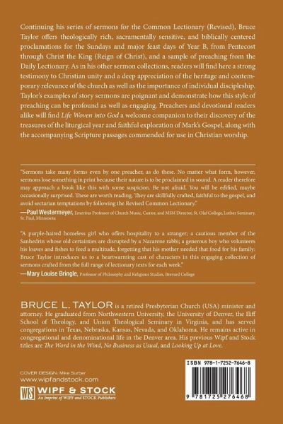 Continuing his series of sermons for the Common Lectionary (Revised), Bruce Taylor offers theologically rich, sacramentally sensitive, and biblically centered proclamations for the Sundays and major feast days of Year B, from Pentecost through Christ the King (Reign of Christ), and a sample of preaching from the Daily Lectionary. As in his other sermon collections, readers will find here a strong testimony to Christian unity and a deep appreciation of the heritage and contemporary relevance of the church as well as the importance of individual discipleship. Taylor's examples of story sermons are poignant and demonstrate how this style of preaching can be profound as well as engaging. Preachers and devotional readers alike will find Life Woven into God a welcome companion to their discovery of the treasures of the liturgical year and faithful exploration of Mark's Gospel, along with the accompanying Scripture passages commended for use in Christian worship.