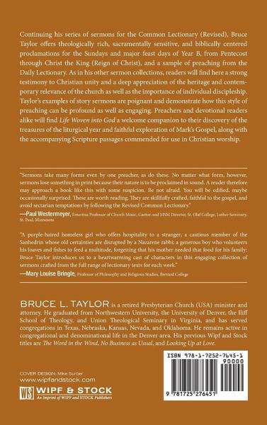 Continuing his series of sermons for the Common Lectionary (Revised), Bruce Taylor offers theologically rich, sacramentally sensitive, and biblically centered proclamations for the Sundays and major feast days of Year B, from Pentecost through Christ the King (Reign of Christ), and a sample of preaching from the Daily Lectionary. As in his other sermon collections, readers will find here a strong testimony to Christian unity and a deep appreciation of the heritage and contemporary relevance of the church as well as the importance of individual discipleship. Taylor's examples of story sermons are poignant and demonstrate how this style of preaching can be profound as well as engaging. Preachers and devotional readers alike will find Life Woven into God a welcome companion to their discovery of the treasures of the liturgical year and faithful exploration of Mark's Gospel, along with the accompanying Scripture passages commended for use in Christian worship.