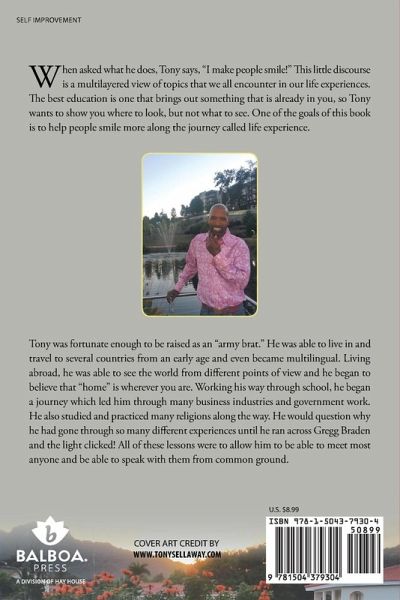 When asked what he does, Tony says, "I make people smile!" This little discourse is a multilayered view of topics that we all encounter in our life experiences. The best education is one that brings out something that is already in you, so Tony wants to show you where to look, but not what to see. One of the goals of this book is to help people smile more along the journey called life experience.