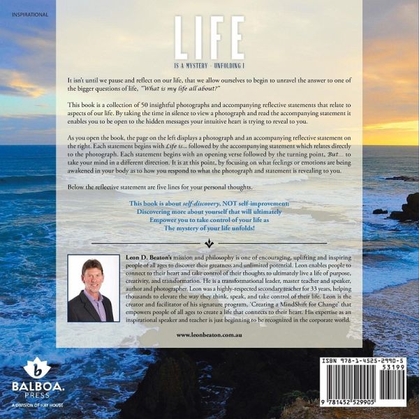 It isn't until we pause and reflect on our life, that we allow ourselves to begin to unravel the answer to one of the bigger questions of life, "What is my life all about?" This book is a collection of 50 insightful photographs and accompanying reflective statements that relate to aspects of our life. By taking the time in silence to view a photograph and read the accompanying statement it enables you to be open to the hidden messages your intuitive heart is trying to reveal to you. As you open the book, the page on the left displays a photograph and an accompanying reflective statement on the right. Each statement begins with Life is... followed by the accompanying statement which relates directly to the photograph. Each statement begins with an opening verse followed by the turning point, But... to take your mind in a different direction. It is at this point, by focusing on what feelings or emotions are being awakened in your body as to how you respond to what the photograph and statement is revealing to you. Below the reflective statement are five lines for your personal thoughts. This book is about self-discovery, NOT self-improvement; Discovering more about yourself that will ultimately Empower you to take control of your life as The mystery of your life unfolds!