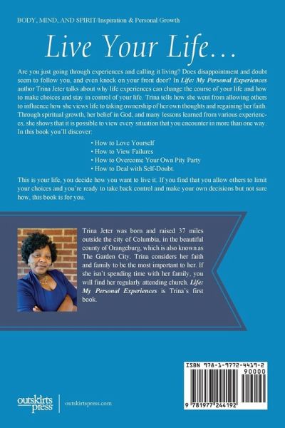 Are you just going through experiences and calling it living? Does disappointment and doubt seem to follow you, and even knock on your front door? In Life: My Personal Experiences author Trina Jeter talks about why life experiences can change the course of your life and how to make choices and stay in control of your life. Trina tells how she went from allowing others to influence how she views life to taking ownership of her own thoughts and regaining her faith. Through spiritual growth, her belief in God, and many lessons learned from various experiences, she shows that it is possible to view every situation that you encounter in more than one way. In this book you'll discover: ¿ How to Love Yourself ¿ How to View Failures ¿ How to Overcome Your Own Pity Party ¿ How to Deal with Self-Doubt. This is your life, you decide how you want to live it. If you find that you allow others to limit your choices and you're ready to take back control and make your own decisions but not sure how, this book is for you.