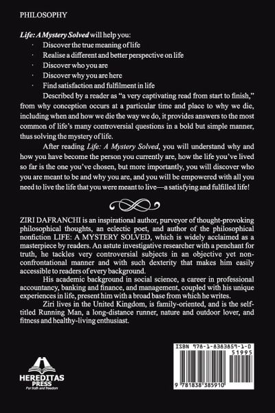 The captivating philosophical nonfiction with answers to many of life's most controversial questions. Book One of the Trilogy of Truth. Life presents a lot of mysteries and is itself a mystery to many people. What is the true meaning of life? What is the purpose of existence? Why does conception take place after a particular intercourse and not another? Why are we born? Why do we die? What happens after we die? These and many others are questions that have left many people baffled. Life: A Mystery Solved takes you through the journey of life, starting from conception and birth to dying and death, during which various mysteries of life are unravelled. More than solving life's mysteries, it helps you discover the real you-the who you are, the purpose behind your existence-the why you are here, how to live a fulfilled life here with a better hope for the hereafter. Ziri also explores how society greatly impacts us by shaping our mindsets due to the societal systems such as the family and educational institutions we are exposed to, with the result that most lives are driven not by purpose but rather by societal norms. Thus he argues for a change of mindset as a prerequisite for a better life experience. Written with Ziri's trademark insightful and inspirational style, this captivating read from start to finish is Life: A Mystery Solved.