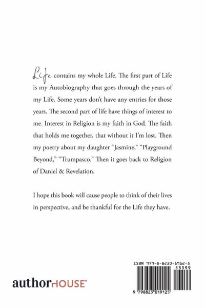 Life contains my whole Life. The first part of Life is my Autobiography that goes through the years of my Life. Some years don't have any entries for those years. The second part of life have things of interest to me. Interest in Religion is my faith in God. The faith that holds me together, that without it I'm lost. Then my poetry about my daughter "Jasmine," "Playground Beyond," "Trumpasco." Then it goes back to Religion of Daniel & Revelation. I hope this book will cause people to think of their lives in perspective, and be thankful for the Life they have.