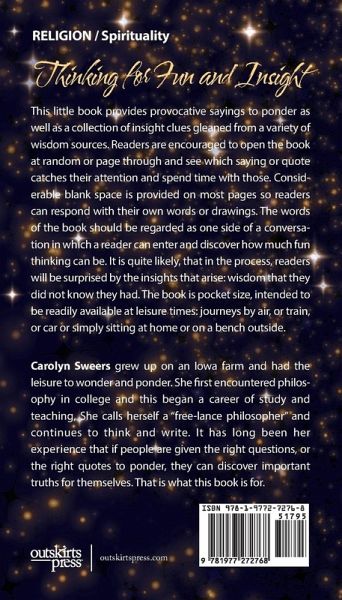 This little book provides provocative sayings to ponder as well as a collection of insight clues gleaned from a variety of wisdom sources. Readers are encouraged to open the book at random or page through and see which saying or quote catches their attention and spend time with those. Considerable blank space is provided on most pages so readers can respond with their own words or drawings. The words of the book should be regarded as one side of a conversation in which a reader can enter and discover how much fun thinking can be. It is quite likely, that in the process, readers will be surprised by the insights that arise: wisdom that they did not know they had. The book is pocket size, intended to be readily available at leisure times: journeys by air, or train, or car or simply sitting at home or on a bench outside.
