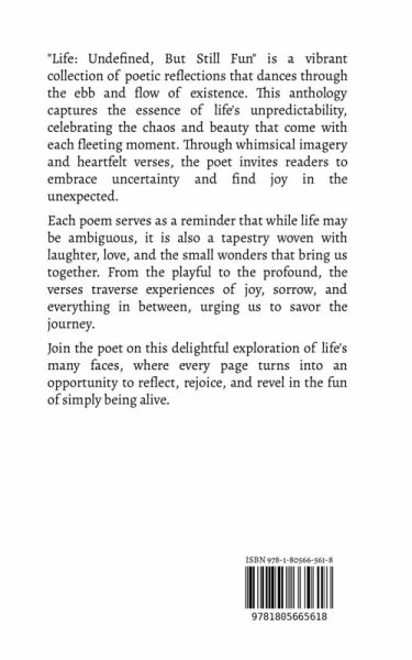 "Life: Undefined, But Still Fun" is a vibrant collection of poetic reflections that dances through the ebb and flow of existence. This anthology captures the essence of life's unpredictability, celebrating the chaos and beauty that come with each fleeting moment. Through whimsical imagery and heartfelt verses, the poet invites readers to embrace uncertainty and find joy in the unexpected. Each poem serves as a reminder that while life may be ambiguous, it is also a tapestry woven with laughter, love, and the small wonders that bring us together. From the playful to the profound, the verses traverse experiences of joy, sorrow, and everything in between, urging us to savor the journey. Join the poet on this delightful exploration of life's many faces, where every page turns into an opportunity to reflect, rejoice, and revel in the fun of simply being alive.