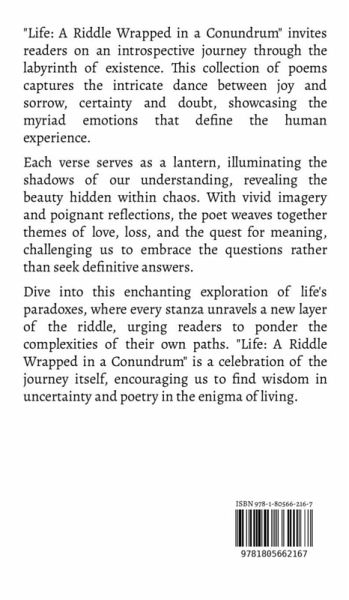 "Life: A Riddle Wrapped in a Conundrum" invites readers on an introspective journey through the labyrinth of existence. This collection of poems captures the intricate dance between joy and sorrow, certainty and doubt, showcasing the myriad emotions that define the human experience. Each verse serves as a lantern, illuminating the shadows of our understanding, revealing the beauty hidden within chaos. With vivid imagery and poignant reflections, the poet weaves together themes of love, loss, and the quest for meaning, challenging us to embrace the questions rather than seek definitive answers. Dive into this enchanting exploration of life's paradoxes, where every stanza unravels a new layer of the riddle, urging readers to ponder the complexities of their own paths. "Life: A Riddle Wrapped in a Conundrum" is a celebration of the journey itself, encouraging us to find wisdom in uncertainty and poetry in the enigma of living.