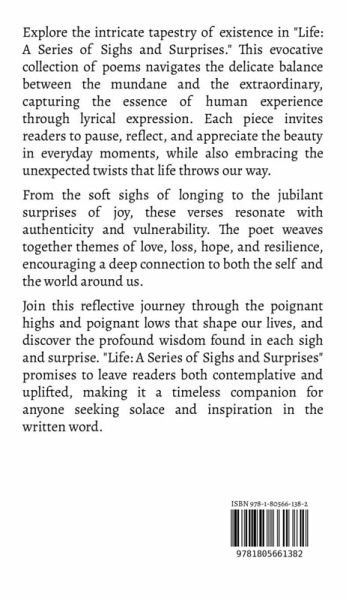 Explore the intricate tapestry of existence in "Life: A Series of Sighs and Surprises." This evocative collection of poems navigates the delicate balance between the mundane and the extraordinary, capturing the essence of human experience through lyrical expression. Each piece invites readers to pause, reflect, and appreciate the beauty in everyday moments, while also embracing the unexpected twists that life throws our way. From the soft sighs of longing to the jubilant surprises of joy, these verses resonate with authenticity and vulnerability. The poet weaves together themes of love, loss, hope, and resilience, encouraging a deep connection to both the self and the world around us. Join this reflective journey through the poignant highs and poignant lows that shape our lives, and discover the profound wisdom found in each sigh and surprise. "Life: A Series of Sighs and Surprises" promises to leave readers both contemplative and uplifted, making it a timeless companion for anyone seeking solace and inspiration in the written word.