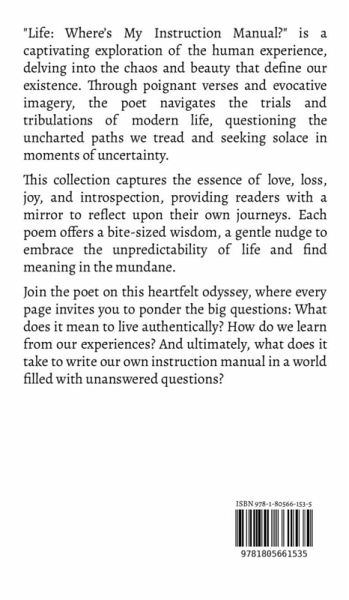 "Life: Where's My Instruction Manual?" is a captivating exploration of the human experience, delving into the chaos and beauty that define our existence. Through poignant verses and evocative imagery, the poet navigates the trials and tribulations of modern life, questioning the uncharted paths we tread and seeking solace in moments of uncertainty. This collection captures the essence of love, loss, joy, and introspection, providing readers with a mirror to reflect upon their own journeys. Each poem offers a bite-sized wisdom, a gentle nudge to embrace the unpredictability of life and find meaning in the mundane. Join the poet on this heartfelt odyssey, where every page invites you to ponder the big questions: What does it mean to live authentically? How do we learn from our experiences? And ultimately, what does it take to write our own instruction manual in a world filled with unanswered questions?