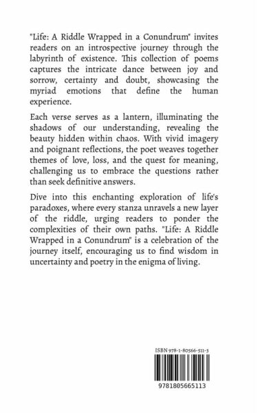 "Life: A Riddle Wrapped in a Conundrum" invites readers on an introspective journey through the labyrinth of existence. This collection of poems captures the intricate dance between joy and sorrow, certainty and doubt, showcasing the myriad emotions that define the human experience. Each verse serves as a lantern, illuminating the shadows of our understanding, revealing the beauty hidden within chaos. With vivid imagery and poignant reflections, the poet weaves together themes of love, loss, and the quest for meaning, challenging us to embrace the questions rather than seek definitive answers. Dive into this enchanting exploration of life's paradoxes, where every stanza unravels a new layer of the riddle, urging readers to ponder the complexities of their own paths. "Life: A Riddle Wrapped in a Conundrum" is a celebration of the journey itself, encouraging us to find wisdom in uncertainty and poetry in the enigma of living.
