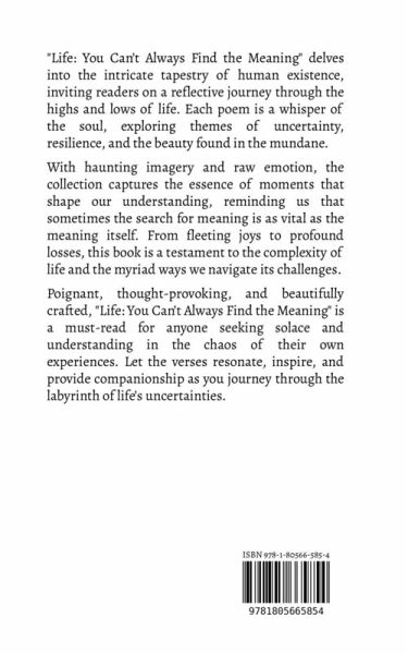 "Life: You Can't Always Find the Meaning" delves into the intricate tapestry of human existence, inviting readers on a reflective journey through the highs and lows of life. Each poem is a whisper of the soul, exploring themes of uncertainty, resilience, and the beauty found in the mundane. With haunting imagery and raw emotion, the collection captures the essence of moments that shape our understanding, reminding us that sometimes the search for meaning is as vital as the meaning itself. From fleeting joys to profound losses, this book is a testament to the complexity of life and the myriad ways we navigate its challenges. Poignant, thought-provoking, and beautifully crafted, "Life: You Can't Always Find the Meaning" is a must-read for anyone seeking solace and understanding in the chaos of their own experiences. Let the verses resonate, inspire, and provide companionship as you journey through the labyrinth of life's uncertainties.