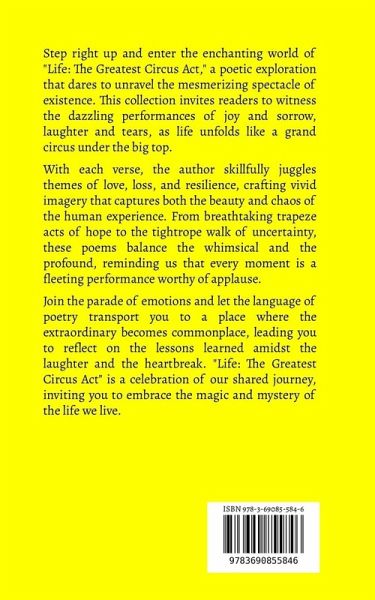 Step right up and enter the enchanting world of "Life: The Greatest Circus Act," a poetic exploration that dares to unravel the mesmerizing spectacle of existence. This collection invites readers to witness the dazzling performances of joy and sorrow, laughter and tears, as life unfolds like a grand circus under the big top. With each verse, the author skillfully juggles themes of love, loss, and resilience, crafting vivid imagery that captures both the beauty and chaos of the human experience. From breathtaking trapeze acts of hope to the tightrope walk of uncertainty, these poems balance the whimsical and the profound, reminding us that every moment is a fleeting performance worthy of applause. Join the parade of emotions and let the language of poetry transport you to a place where the extraordinary becomes commonplace, leading you to reflect on the lessons learned amidst the laughter and the heartbreak. "Life: The Greatest Circus Act" is a celebration of our shared journey, inviting you to embrace the magic and mystery of the life we live.
