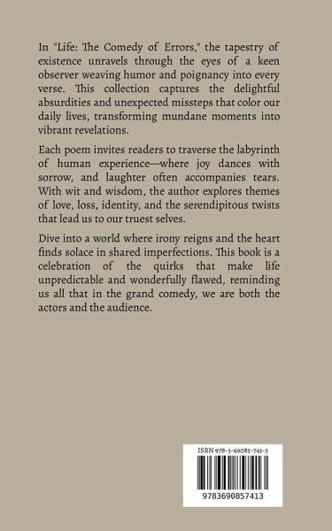 In "Life: The Comedy of Errors," the tapestry of existence unravels through the eyes of a keen observer weaving humor and poignancy into every verse. This collection captures the delightful absurdities and unexpected missteps that color our daily lives, transforming mundane moments into vibrant revelations. Each poem invites readers to traverse the labyrinth of human experience-where joy dances with sorrow, and laughter often accompanies tears. With wit and wisdom, the author explores themes of love, loss, identity, and the serendipitous twists that lead us to our truest selves. Dive into a world where irony reigns and the heart finds solace in shared imperfections. This book is a celebration of the quirks that make life unpredictable and wonderfully flawed, reminding us all that in the grand comedy, we are both the actors and the audience.