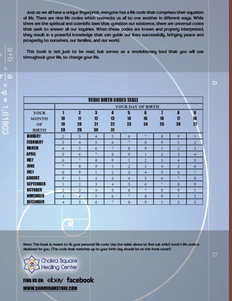 This book is for you if you were born on: Jan 01,10,19,28;Feb 09,18,27;Mar 08,17,26;Apr 07,16,25;May 06,15,24;Jun 05,14,23;Jul 04,13,22,31; Aug 03,12,21,30; Sep 02,11,20,29-;Oct 01,10-,19,28;Nov 09, 18,27;Dec 08,17,26. Just as we all have a unique fingerprint, everyone has a Life Code that comprises his or her equation of life. Nine codes connect us to one another in different ways. While there are the spiritual and scientific laws that question our existence, there are universal codes that can answer our inquiries. When you know these codes, they result in powerful knowledge that can guide our lives to success, peace and prosperity.