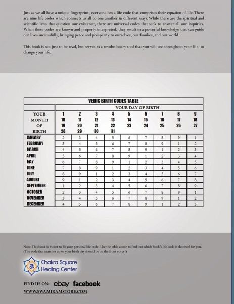 This book is for you if you were born on: Jan 01,10,19,28;Feb 09,18,27;Mar 08,17,26;Apr 07,16,25;May 06,15,24;Jun 05,14,23;Jul 04,13,22,31; Aug 03,12,21,30; Sep 02,11,20,29-;Oct 01,10-,19,28;Nov 09, 18,27;Dec 08,17,26. Just as we all have a unique fingerprint, everyone has a Life Code that comprises his or her equation of life. Nine codes connect us to one another in different ways. While there are the spiritual and scientific laws that question our existence, there are universal codes that can answer our inquiries. When you know these codes, they result in powerful knowledge that can guide our lives to success, peace and prosperity.