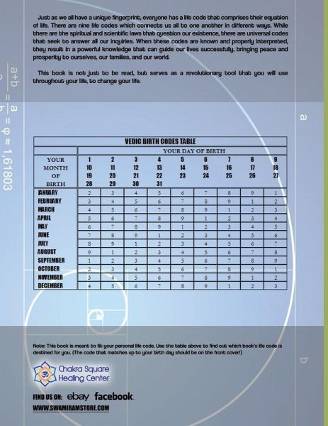 This book is for you if you were born on: Jan 03,12,21,30; Feb 02,11,20,29; Mar 01,10,19,28; Apr 09,18,27; May 08,17,26; Jun 07,16,25; Jul 06,15,24; Aug 05,14,23; Sep 04,13,22; Oct 03,12,21,30; Nov 02,11,20,29; Dec 01,10,19,28. Just as we all have a unique fingerprint, everyone has a Life Code that comprises his or her equation of life. Nine codes connect us to one another in different ways. While there are the spiritual and scientific laws that question our existence, there are universal codes that can answer our inquiries. When you know these codes, they result in powerful knowledge that can guide our lives to success, peace and prosperity.