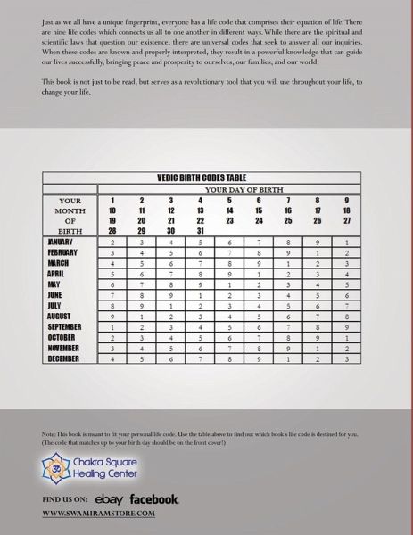 This book is for you if you were born on: Jan 04,13,22-,31; Feb 03,12,21; Mar 02,11,20,29; Apr 01,10,19,28; May 09,18,27; Jun 08,17,26; Jul 07,16,25; Aug 06,15,24; Sep 05,14,23; Oct 04,13,22,31; Nov 03,12,21, 30; Dec 02,11,20,29. Just as we all have a unique fingerprint, everyone has a Life Code that comprises his or her equation of life. Nine codes connect us to one another in different ways. While there are the spiritual and scientific laws that question our existence, there are universal codes that can answer our inquiries. When you know these codes, they result in powerful knowledge that can guide our lives to success, peace and prosperity.