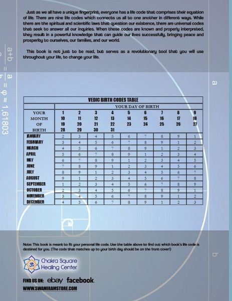 This book is for you if you were born on: Jan 05,14,23; Feb 04,13,22; Mar 03,12,21,30; Apr 02,11,20,29; May 01,10,19,28; Jun 09,18,27; Jul 08,17,26; Aug 07,16,25; Sep 06,15,24; Oct 05,14,23; Nov 04,13,22; Dec 03,12,21,30. Just as we all have a unique fingerprint, everyone has a Life Code that comprises his or her equation of life. Nine codes connect us to one another in different ways. While there are the spiritual and scientific laws that question our existence, there are universal codes that can answer our inquiries. When you know these codes, they result in powerful knowledge that can guide our lives to success, peace and prosperity.