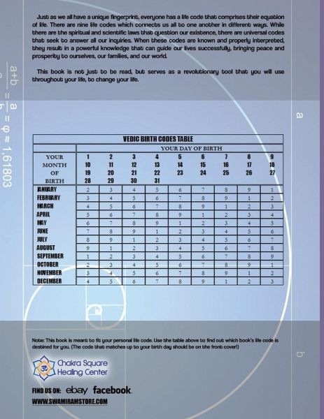 This book is for you if you were born on: Jan 08,17,26; Feb 07,16,25; Mar 06,15,24; Apr 05,14,23; May 04,13,22,31; Jun 03,12,21,30; Jul 02,11,20,29; Aug 01,10,19,28; Sep 09,18,27; Oct 08,17,26;Nov 07,16,25; Dec 06,15,24. Just as we all have a unique fingerprint, everyone has a Life Code that comprises his or her equation of life. Nine codes connect us to one another in different ways. While there are the spiritual and scientific laws that question our existence, there are universal codes that can answer our inquiries. When you know these codes, they result in powerful knowledge that can guide our lives to success, peace and prosperity.