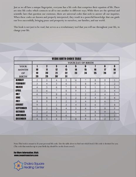 This book is for you if you were born on: Jan 08,17,26; Feb 07,16,25; Mar 06,15,24; Apr 05,14,23; May 04,13,22,31; Jun 03,12,21,30; Jul 02,11,20,29; Aug 01,10,19,28; Sep 09,18,27; Oct 08,17,26;Nov 07,16,25; Dec 06,15,24. Just as we all have a unique fingerprint, everyone has a Life Code that comprises his or her equation of life. Nine codes connect us to one another in different ways. While there are the spiritual and scientific laws that question our existence, there are universal codes that can answer our inquiries. When you know these codes, they result in powerful knowledge that can guide our lives to success, peace and prosperity.