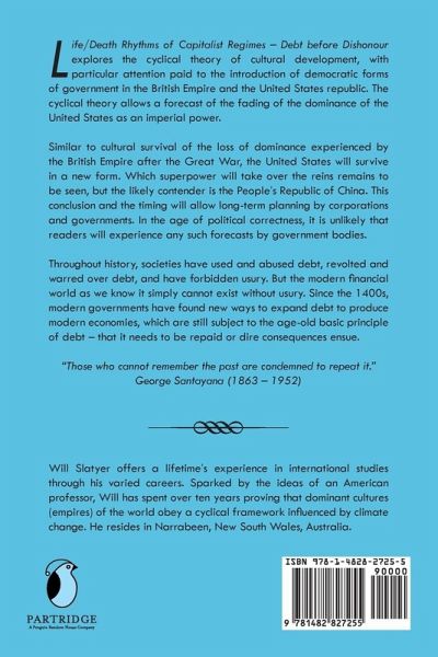 Life/Death Rhythms of Capitalist Regimes-Debt before Dishonour explores the cyclical theory of cultural development, with particular attention paid to the introduction of democratic forms of government in the British Empire and the United States republic. The cyclical theory allows a forecast of the fading of the dominance of the United States as an imperial power. Similar to cultural survival of the loss of dominance experienced by the British Empire after the Great War, the United States will survive in a new form. Which superpower will take over the reins remains to be seen, but the likely contender is the People's Republic of China. This conclusion and the timing will allow long-term planning by corporations and governments. In the age of political correctness, it is unlikely that readers will experience any such forecasts by government bodies. Throughout history, societies have used and abused debt, revolted and warred over debt, and have forbidden usury. But the modern financial world as we know it simply cannot exist without usury. Since the 1400s, modern governments have found new ways to expand debt to produce modern economies, which are still subject to the age-old basic principle of debt-that it needs to be repaid or dire consequences ensue. "Those who cannot remember the past are condemned to repeat it." -George Santayana (1863-1952)