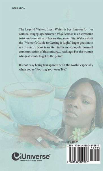 The Legend Writer, Inger Wafer is best known for her comical stageplays however, #LifeLessons is an awesome twist and revelation of her writing versatility. Wafer calls it the "Women's Guide to Getting it Right." Inger goes on to say the entire book is written in the most popular form of communication of this century… hashtags; For the woman who just want's to get to the point! It's not easy being transparent with the world; especially when you're "Pouring Your own Tea."