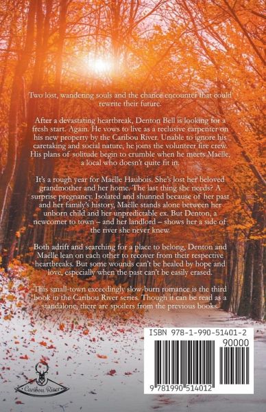 Two lost, wandering souls and the chance encounter that could rewrite their future. After a devastating heartbreak, Denton Bell is looking for a fresh start. Again. He vows to live as a reclusive carpenter on his new property by the Caribou River. Unable to ignore his caretaking and social nature, he joins the volunteer fire crew. His plans of solitude begin to crumble when he meets Maëlle, a local who doesn't quite fit in. It's a rough year for Maëlle Haubois. She's lost her beloved grandmother and her home. The last thing she needs? A surprise pregnancy. Isolated and shunned because of her past and her family's history, Maëlle stands alone between her unborn child and her unpredictable ex. But Denton, a newcomer to town – and her landlord – shows her a side of the river she never knew. Both adrift and searching for a place to belong, Denton and Maëlle lean on each other to recover from their respective heartbreaks. But some wounds can't be healed by hope and love, especially when the past can't be easily erased. This small-town exceedingly slow-burn romance is the third book in the Caribou River series. Though it can be read as a standalone, there are spoilers from the previous books.