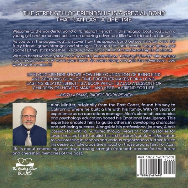 Book synopsis: Welcome to the wonderful world of "Lifelong Friends"! In this magical book, you'll join a young girl and her animal pals on an amazing adventure filled with friendship and fun. As you turn the pages, you'll discover how this special bond between the girl and her furry friends grows stronger and stronger. Through ups and downs, happy times, and sadness, they stick together like glue, showing us all what true friendship is all about. With its heartwarming story and beautiful illustrations, "Lifelong Friends" will capture your imagination and warm your heart. So come along and join the adventure - you won't want to miss it! Autobiography: Alan Miniter, originally from the East Coast, found his way to California where he built a life with his family. With 40 years of experience as an operations manager, Alan's blend of economics and psychology education honed his Emotional Intelligence. This expertise enabled him to guide others in developing character and achieving success. Alongside his professional journey, Alan's passion for writing, nurtured through years of crafting stories for loved ones, led him to publish his first children's book. His dedication to volunteering in schools and various organizations further fueled his desire to make a positive impact on those around him. For Alan, life is about embracing each day, drawing strength from both dreams for the future and cherished memories of the past. Illustrators Autobiography: Shirley Fowley taught art at the senior public school level of the Waterloo Regional Board of Education for 33 years. She honed her skills by earning qualification certificates and taking university summer courses at The Ontario College of Art, University of Waterloo, Laurier University, and private art lessons. Her talent is inherited from a long line of artistic forebears. She primarily enjoys painting acrylic or watercolour landscapes and creating and drawing cartoons and humorous pictures. Other artistic endeavours include ten years of designing and building award-winning floats for the Oktoberfest Parade, designing and painting theatre sets for many musical productions and creating theatrical props. She has designed the lighting and stage managed many dance shows as well as directed and staged two gala fundraising shows for the Chinese Cultural Community at the Centre in the Square, Kitchener.