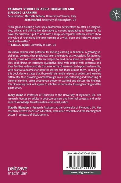 This book explores the potential for lifelong learning in dementia. A growing social issue, dementia has previously been understood as a wasteland for learning: at best, those with dementia are helped to hold on to some pre-existing skills. This book draws on extensive qualitative data with people with dementia and their families to demonstrate that new forms of learning can happen in dementia, with positive outcomes for both the learner and those around them. In doing so, this book demonstrates that those with dementia help us to understand learning differently, thus providing a breakthrough in our understanding and theorising of lifelong learning. Using posthuman theory to scaffold and discuss the findings, this pioneering book will appeal to scholars of dementia, lifelong learning and the posthuman.