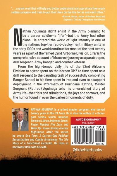 "Lifer is an insightful behind-the-curtain look into the life and career of a US Army Infantry paratrooper and a must read for other combat veterans regardless of service."-Colonel Carl D. Matter, US Marine Corps (Retired) "...a gripping and inspirational journey, reflecting the resilience and dedication required of our soldiers."-Major Roberto Lainez, US Army (Retired) Nathan Aguinaga didn't enlist in the Army planning to be a career soldier-a "lifer"-but the Army had other plans. He entered the world of light infantry in one of the nation's top-tier rapid-deployment military units in the early 1990s and would continue for most of the next twenty years as a part of the famed 82nd Airborne Division. Lifer is the comprehensive account of his career journey as a paratrooper, drill sergeant, Army Ranger, and combat veteran. From the high-tempo daily life of the 82nd Airborne Division to a year spent on the Korean DMZ to time spent as a drill sergeant to the daunting task of successfully completing Ranger School to his time spent in Iraq and even to a support deployment in the aftermath of Hurricane Katrina, Master Sergeant (Retired) Aguinaga tells his unvarnished story of Army life-the trials and tribulations, the joys and sorrows, and the humor found in even the darkest moments of duty.