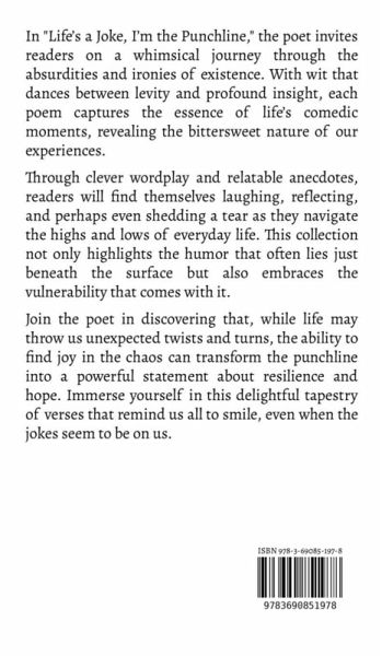 In "Life's a Joke, I'm the Punchline," the poet invites readers on a whimsical journey through the absurdities and ironies of existence. With wit that dances between levity and profound insight, each poem captures the essence of life's comedic moments, revealing the bittersweet nature of our experiences. Through clever wordplay and relatable anecdotes, readers will find themselves laughing, reflecting, and perhaps even shedding a tear as they navigate the highs and lows of everyday life. This collection not only highlights the humor that often lies just beneath the surface but also embraces the vulnerability that comes with it. Join the poet in discovering that, while life may throw us unexpected twists and turns, the ability to find joy in the chaos can transform the punchline into a powerful statement about resilience and hope. Immerse yourself in this delightful tapestry of verses that remind us all to smile, even when the jokes seem to be on us.