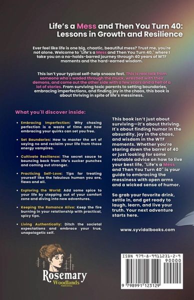 Life's a Mess and Then You Turn 40: Lessons in Growth & Resilience "Life's a Mess and Then You Turn 40: Lessons in Growth & Resilience" is an unapologetically honest and insightful guide through the rollercoaster of life. S.Y. Vidal shares deeply personal experiences, transforming them into powerful lessons that resonate with anyone seeking to navigate the ups and downs of their journey. This book delves into the essential aspects of personal growth and resilience, from embracing imperfections and finding strength in vulnerability to mastering the art of saying no and keeping romance alive. With chapters on gratitude, empathy, mindfulness, and the joy of travel, Vidal provides a comprehensive roadmap to a fulfilling life. Blending humor, direct honesty, and empathetic reflection, Vidal's voice makes "Life's a Mess and Then You Turn 40" both engaging and profoundly relatable. Whether you're on the brink of a major life transition or simply looking for inspiration to tackle daily challenges, this book is your companion on the path to becoming your most authentic and resilient self. Discover how to: Embrace Imperfection: Learn why striving for perfection is overrated and how embracing your flaws can lead to a more authentic, confident you. Set Boundaries: Master the art of saying no and reclaim your time and energy from people who don't respect your limits. Cultivate Resilience: Develop the inner strength to bounce back from life's setbacks and keep moving forward. Practice Self-Love: Treat yourself with the kindness and respect you deserve. Celebrate your progress, no matter how small. Explore the World: Add spice to your life by stepping out of your comfort zone and discovering new places and cultures. Build Community: Experience the joy and fulfillment that comes from giving back and being part of a supportive community. Find Peace: Use mindfulness and meditation to stay grounded and calm, even when life feels like a never-ending episode of "Survivor." Keep the Romance Alive: Discover tips and tricks for keeping your romantic relationship spicy and alive, ensuring that love and passion continue to flourish. Live Authentically: Embrace who you are, unapologetically. Ditch societal expectations and celebrate your unique self.